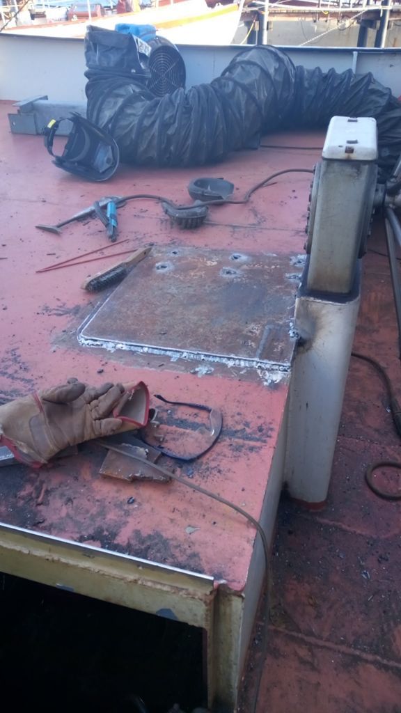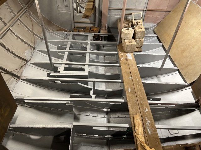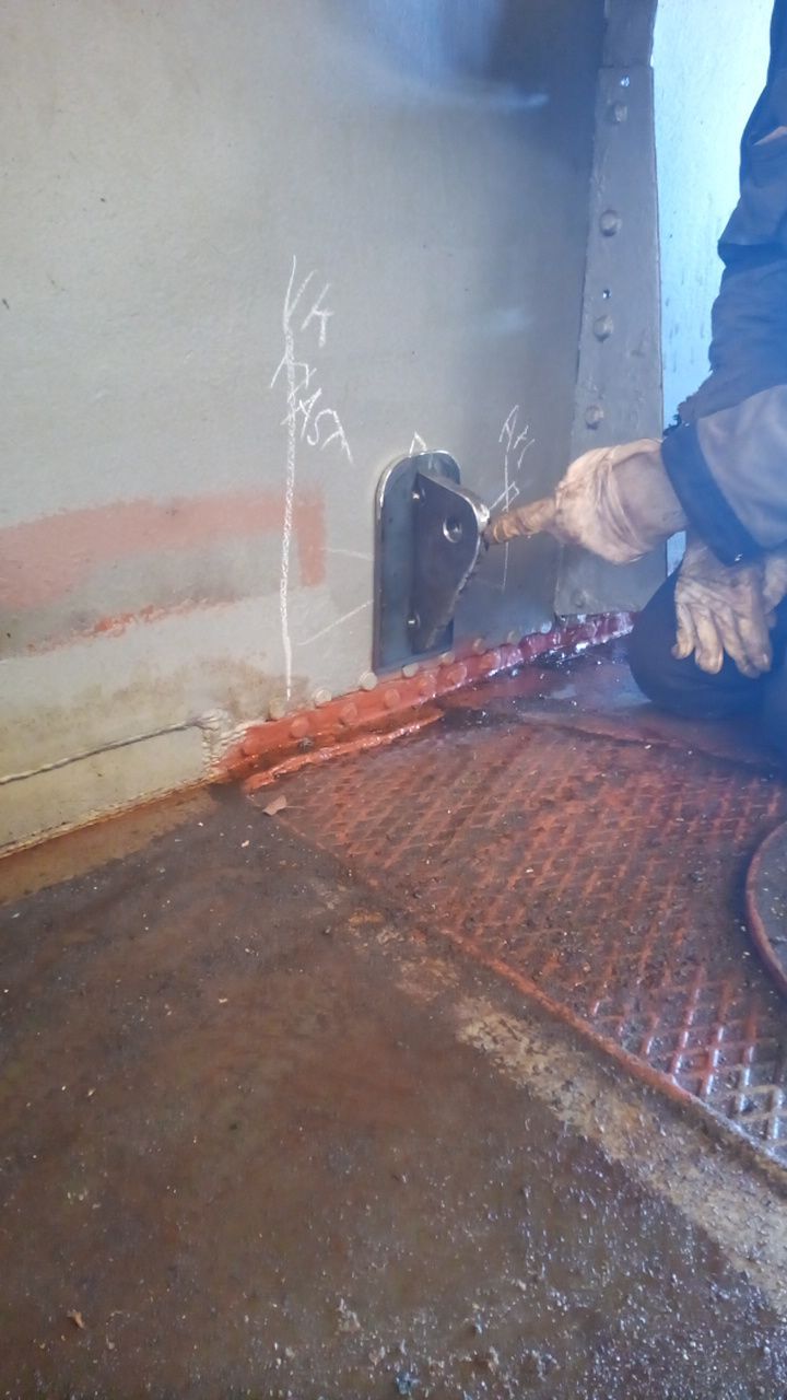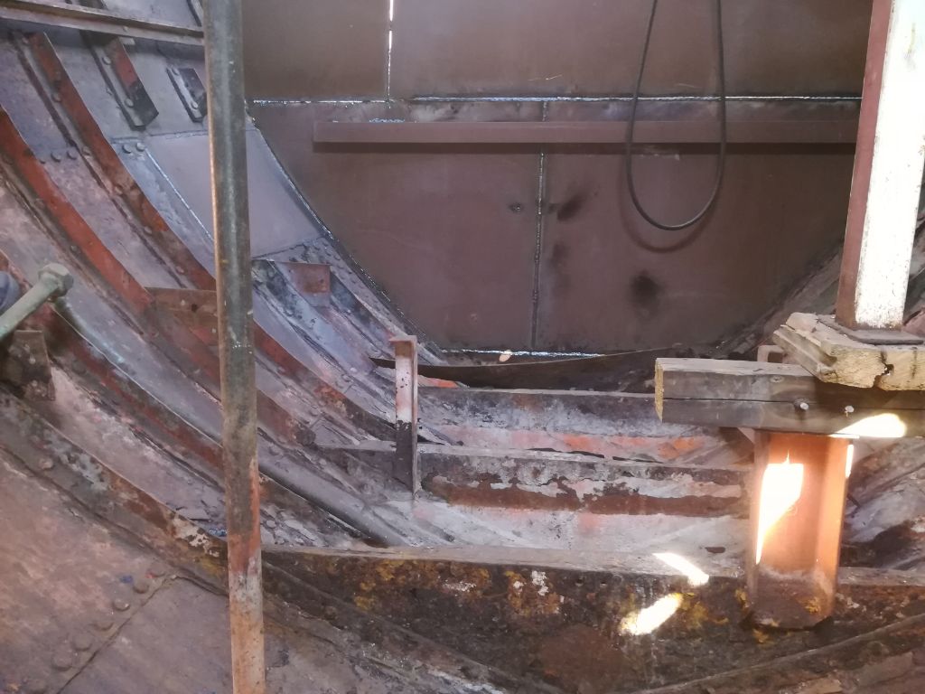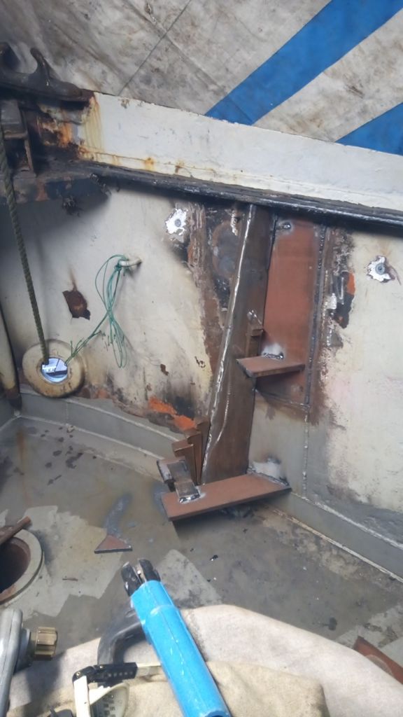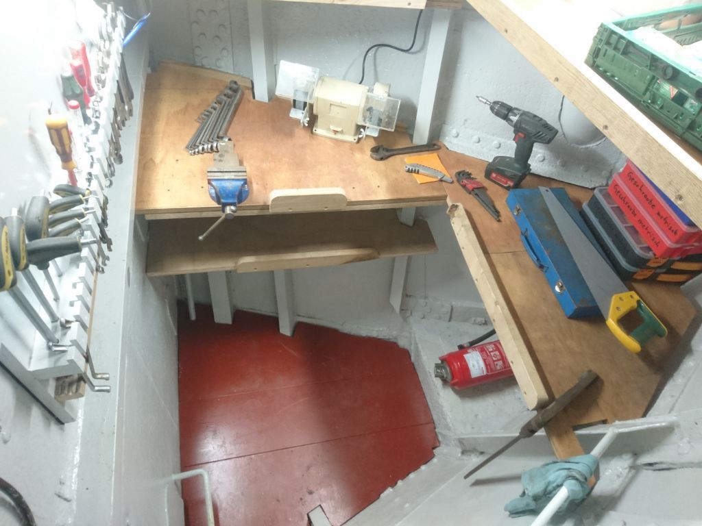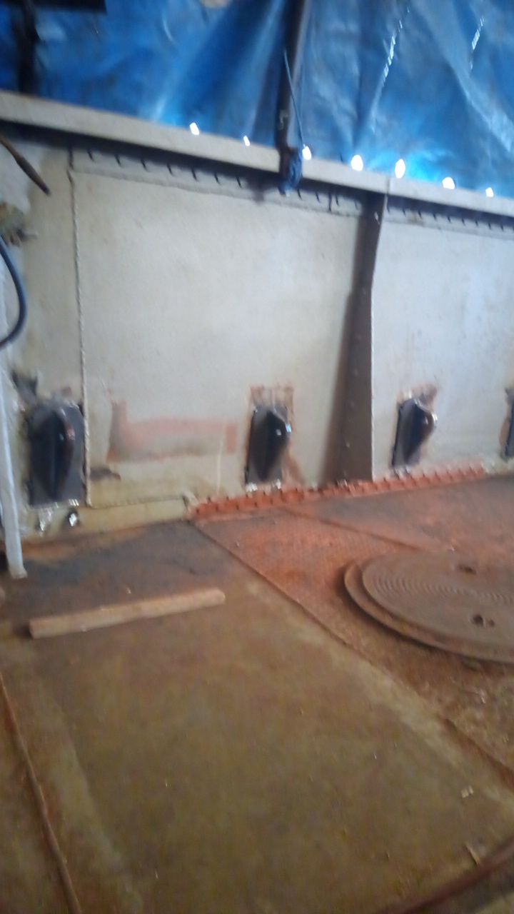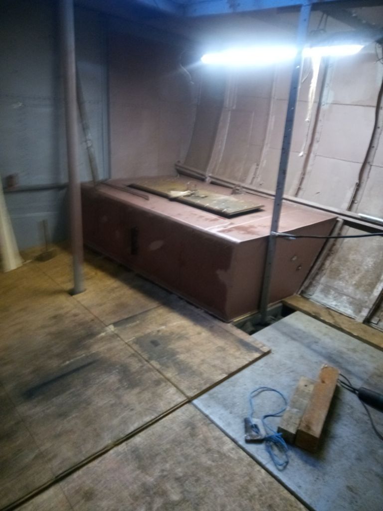 Seemann hat die Bilge in Schuss gebracht. Sie wurde entrostet, gereinigt und angepinselt. Bevor die Gewichte im Juni eingebracht werden können , müssen noch die Gummimatten in die Bilgenfächer verlegt werden.