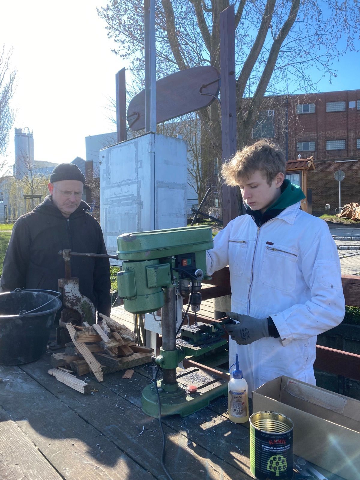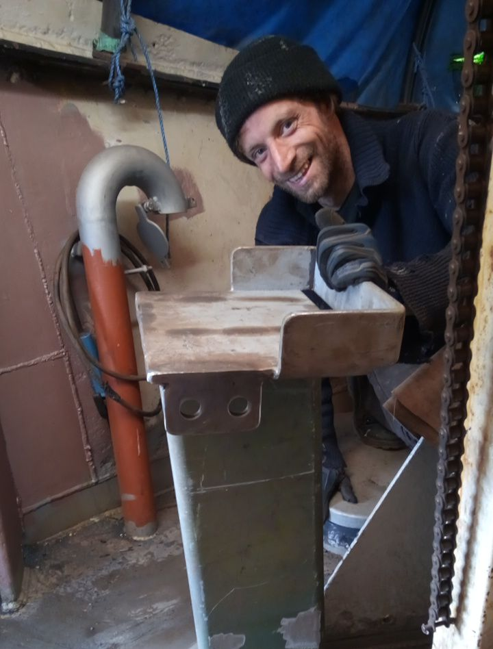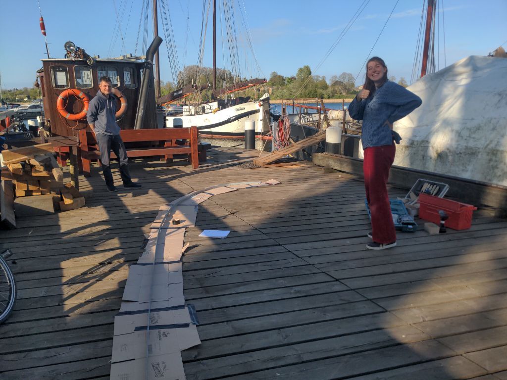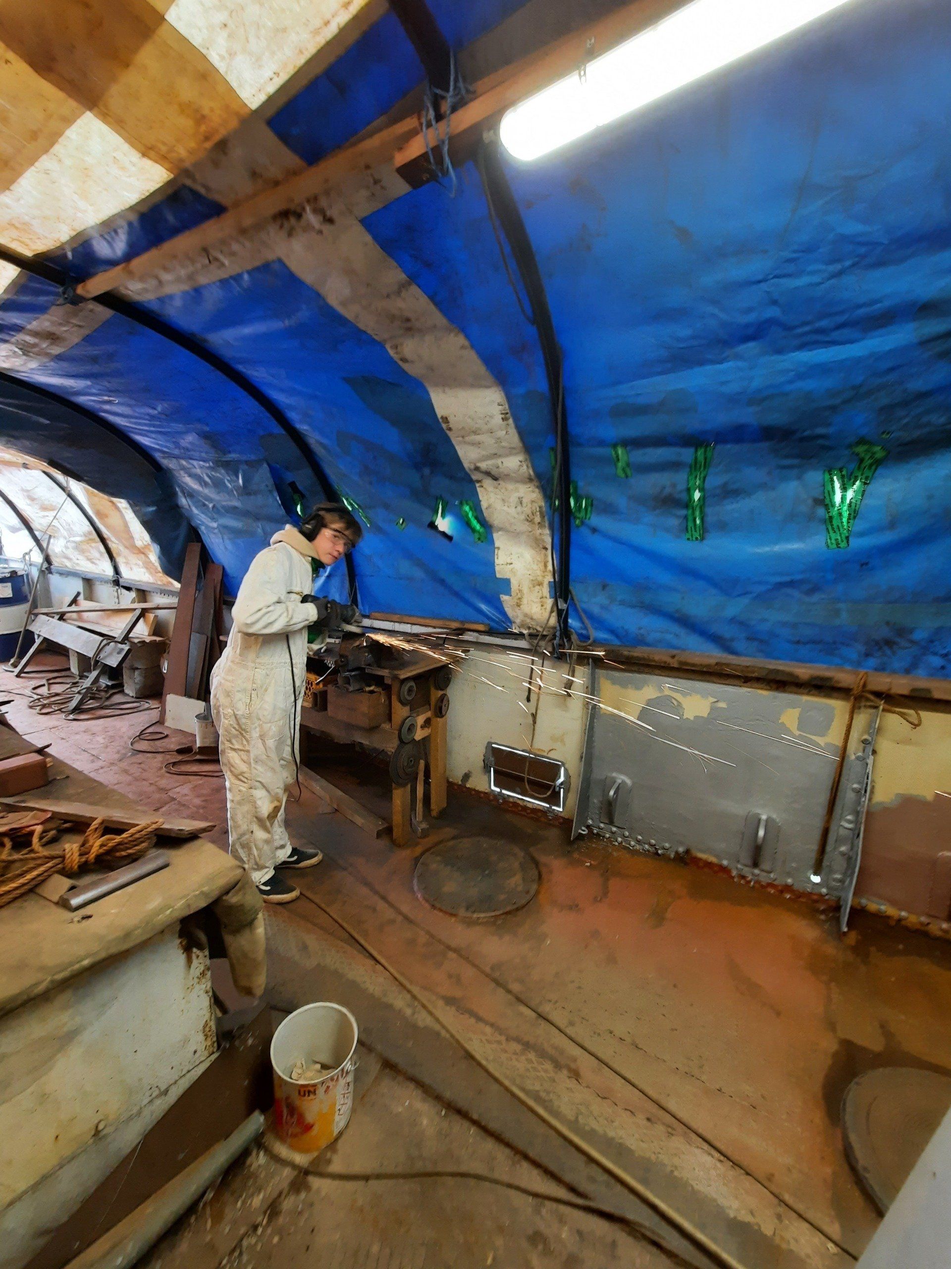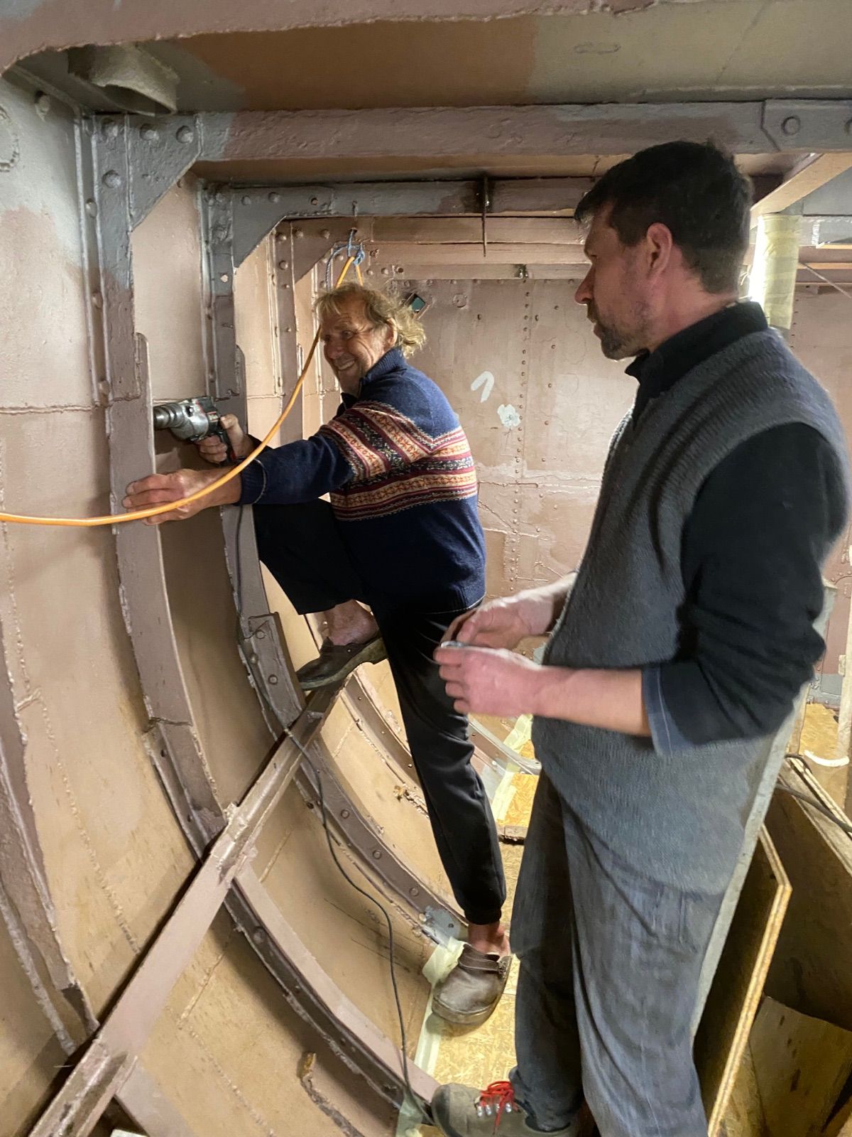 Ostern fand eine intensive Werkelwoche statt, bei der es viel Unterstützung gab. Zum Beispiel von Paul, der uns eine neue und vertrauenswürdigere Gangway gebaut hat. Papa Holger hat fleißig Löcher in die Spanten gebohrt, damit dort später die Unterkonstruktion für die Innenverkleidung befestigt werden kann. Im Logis wurde der restliche Ballast verteilt und gesichert und eine Unterkonstruktion gebaut, um anschließend auch dort den Baufußboden zu verlegen. Wir haben gemeinsam geschweißt, geschleift, lackiert, entrostet, geräumt und gereinigt, gebohrt und gesägt. Simon hat einen Kettenstopper eingebaut und die Klüverstütze repariert. Und wir waren fast vollständig und hatten Zeit, um viele Dinge zu beschnacken. Unter anderem die Position der Nagelbänke. Mit der Produktion der Nägel hat Carsten schon angefangen.