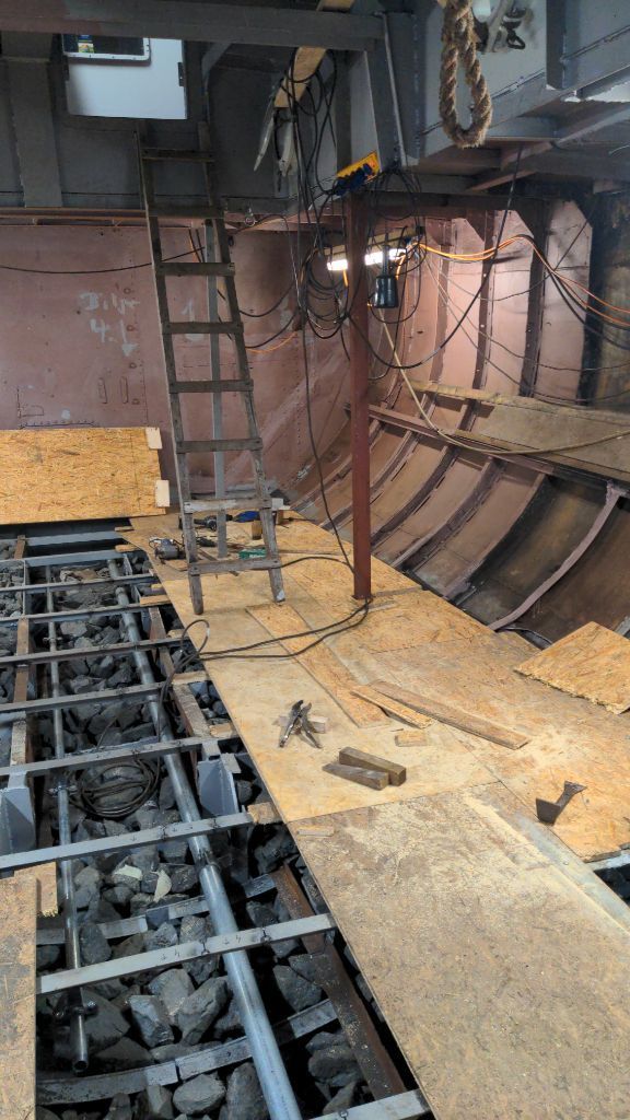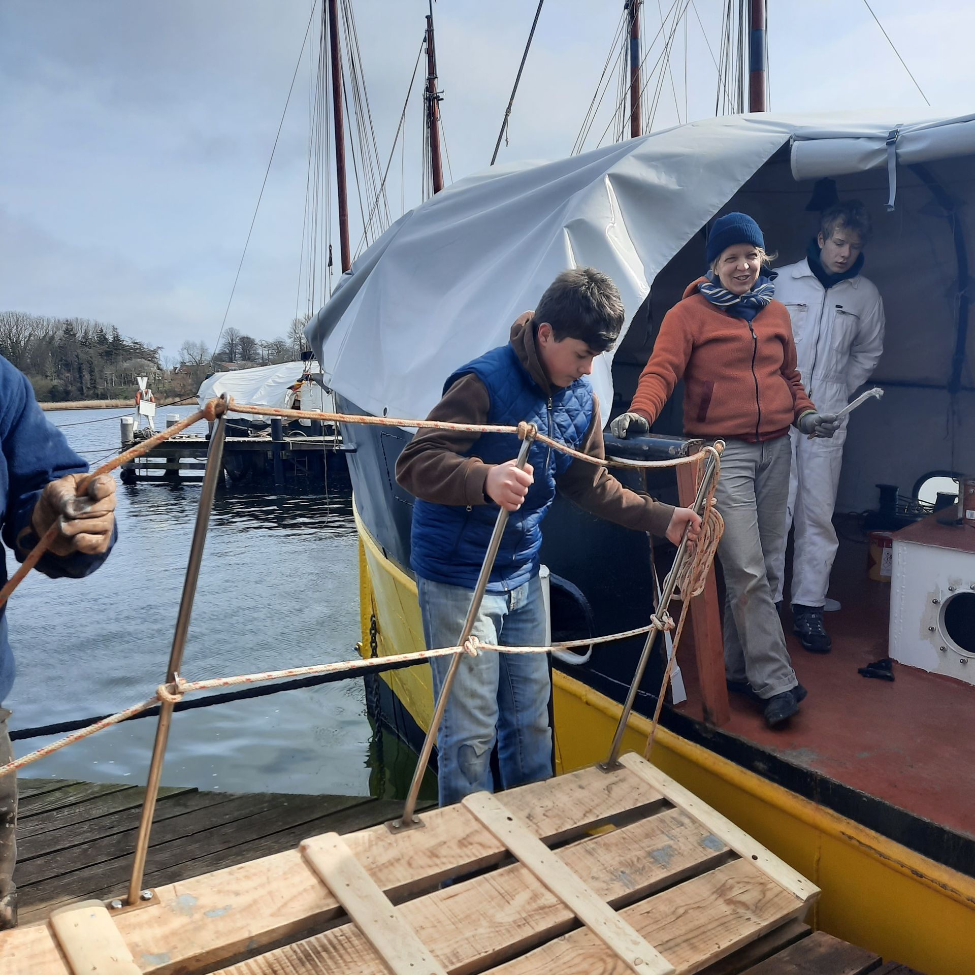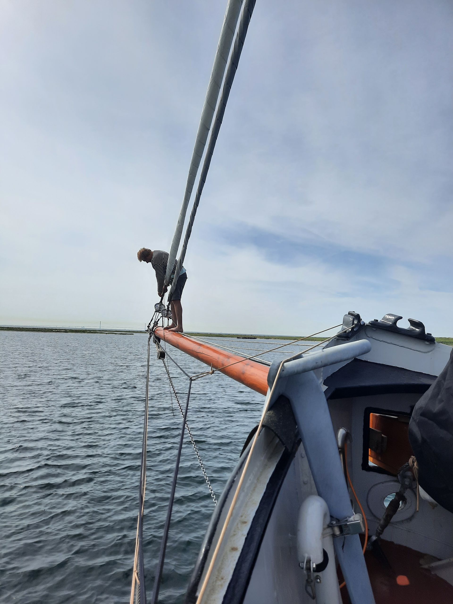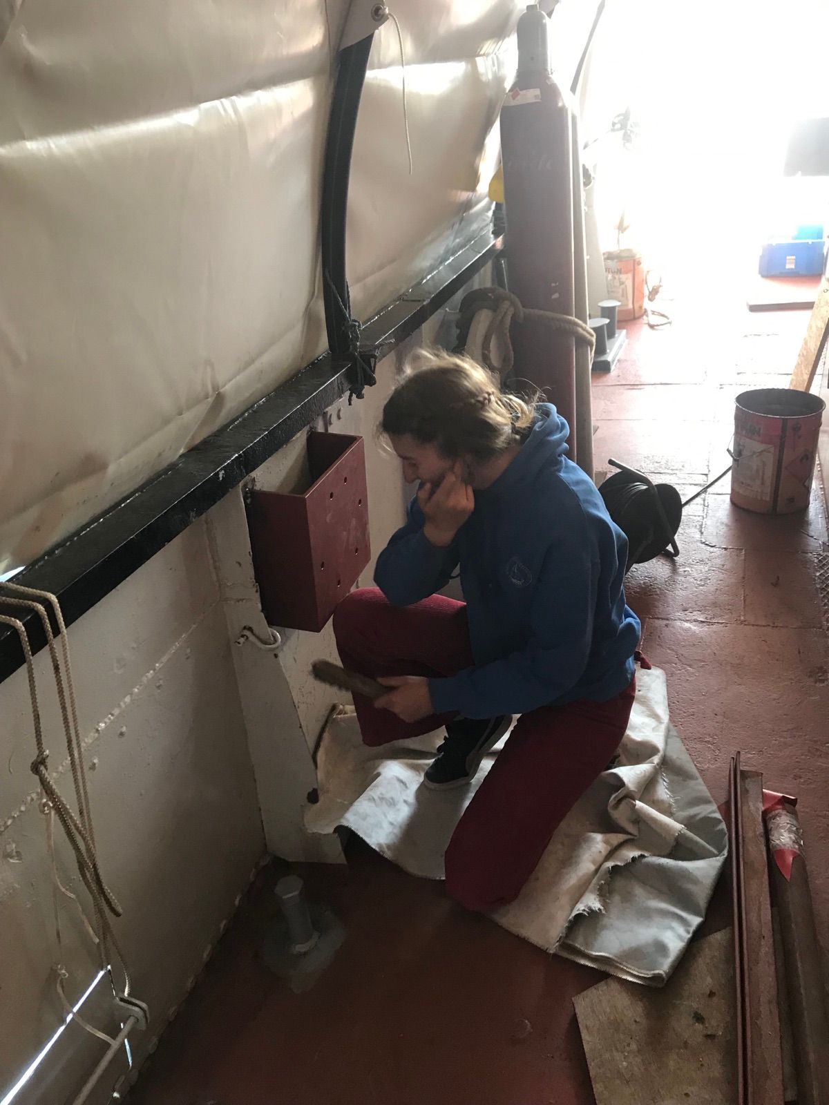 Ostern fand eine intensive Werkelwoche statt, bei der es viel Unterstützung gab. Zum Beispiel von Paul, der uns eine neue und vertrauenswürdigere Gangway gebaut hat. Papa Holger hat fleißig Löcher in die Spanten gebohrt, damit dort später die Unterkonstruktion für die Innenverkleidung befestigt werden kann. Im Logis wurde der restliche Ballast verteilt und gesichert und eine Unterkonstruktion gebaut, um anschließend auch dort den Baufußboden zu verlegen. Wir haben gemeinsam geschweißt, geschleift, lackiert, entrostet, geräumt und gereinigt, gebohrt und gesägt. Simon hat einen Kettenstopper eingebaut und die Klüverstütze repariert. Und wir waren fast vollständig und hatten Zeit, um viele Dinge zu beschnacken. Unter anderem die Position der Nagelbänke. Mit der Produktion der Nägel hat Carsten schon angefangen.