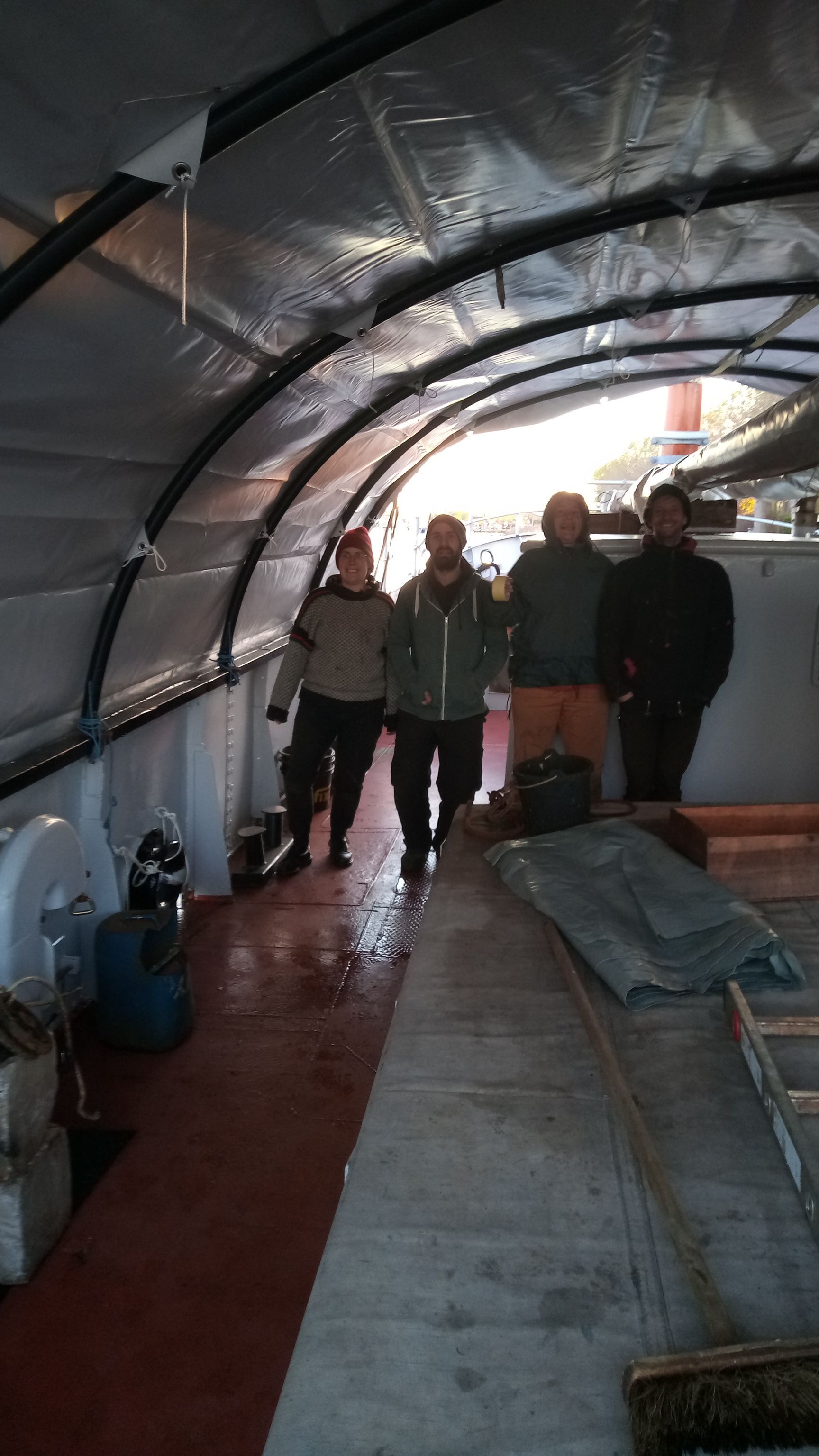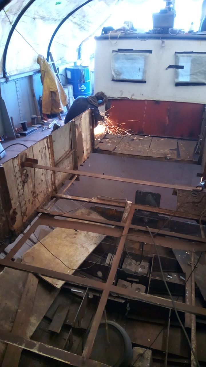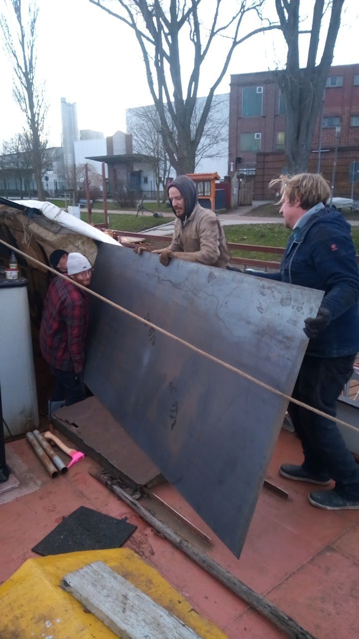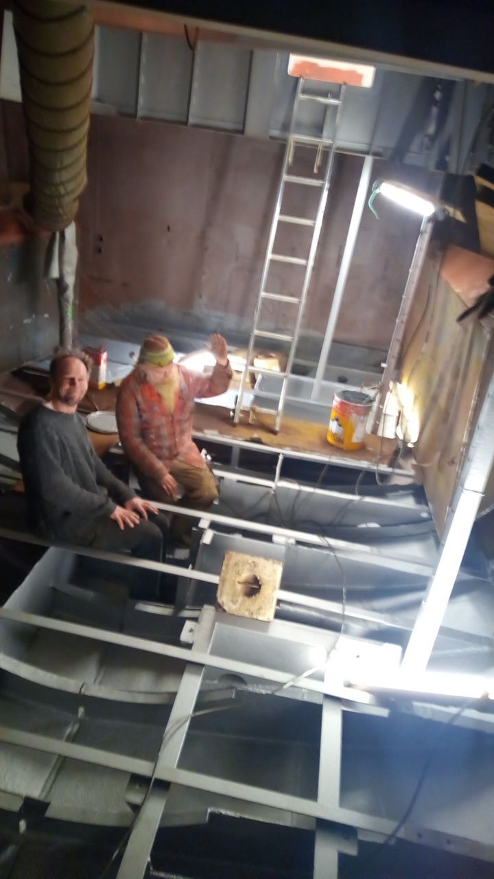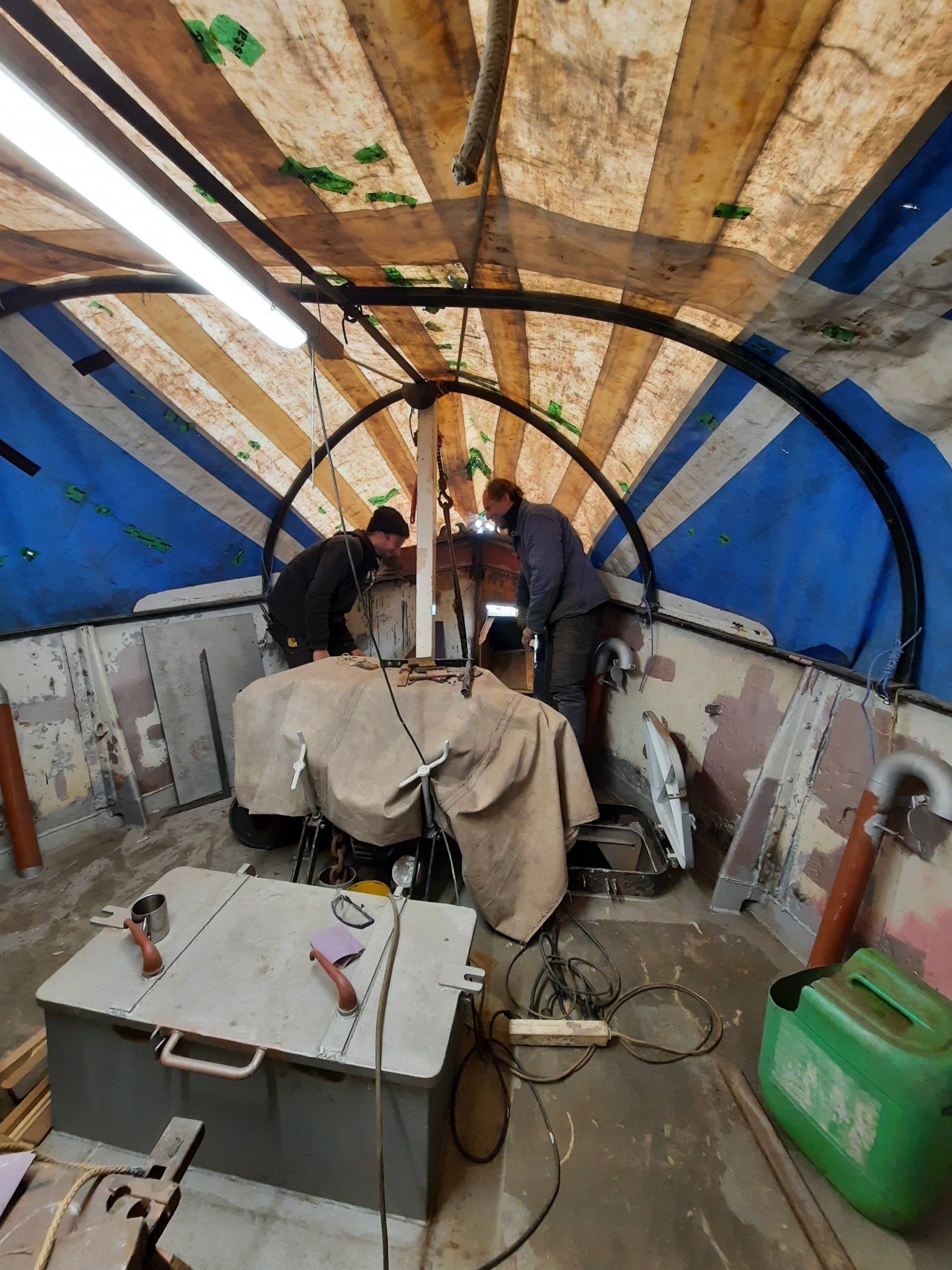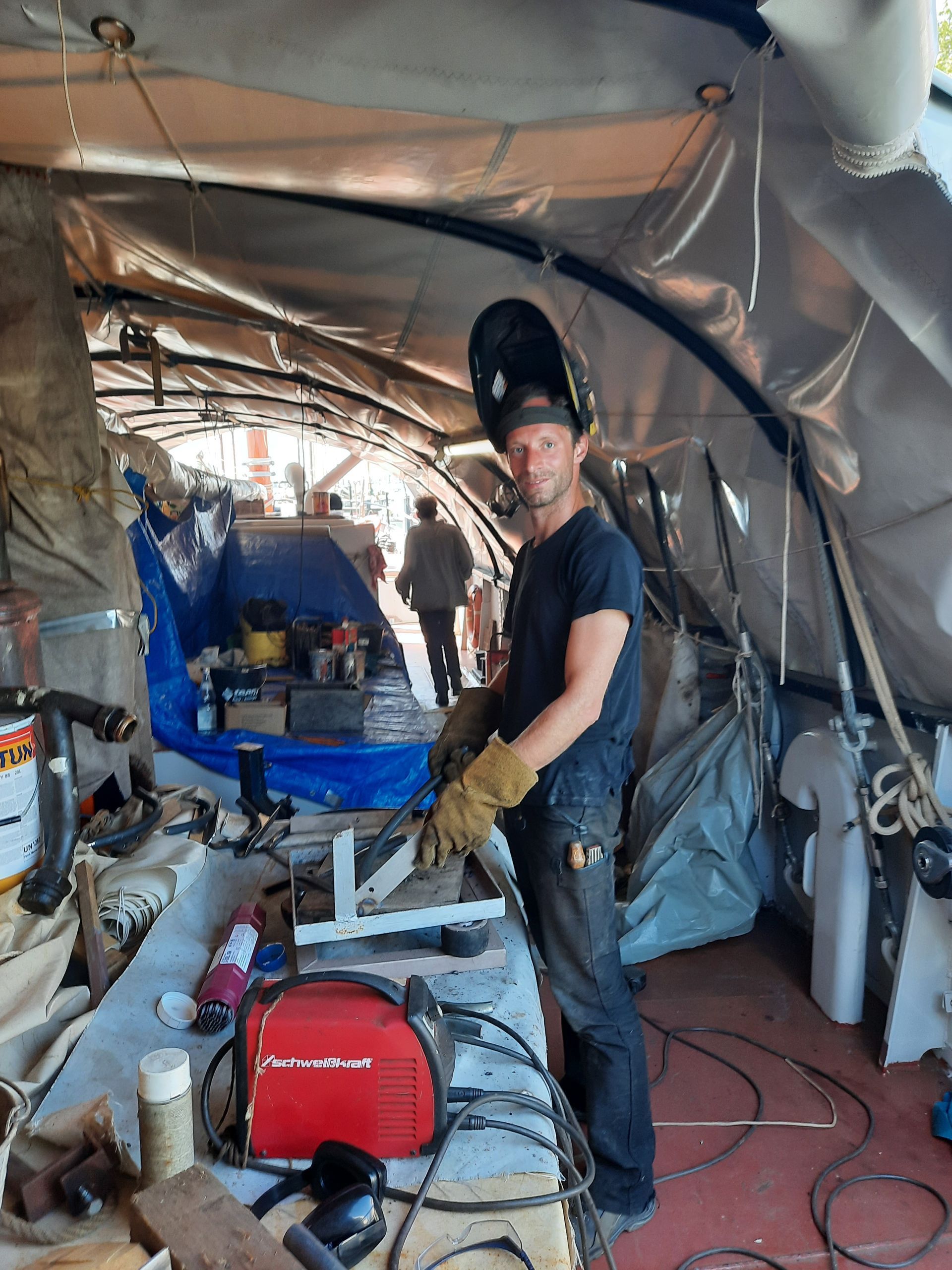 Die Segel sind leider wieder ab und FIX liegt eingepackt unter einer Arbeitsplane. Jetzt im Winter kann Carsten wieder ständig vor Ort sein, um die verbleibenden Arbeiten voranzutreiben. FIX hat zwei Wassertanks bekommen, die von Kamil und Marcin zusammengeschweißt worden sind.