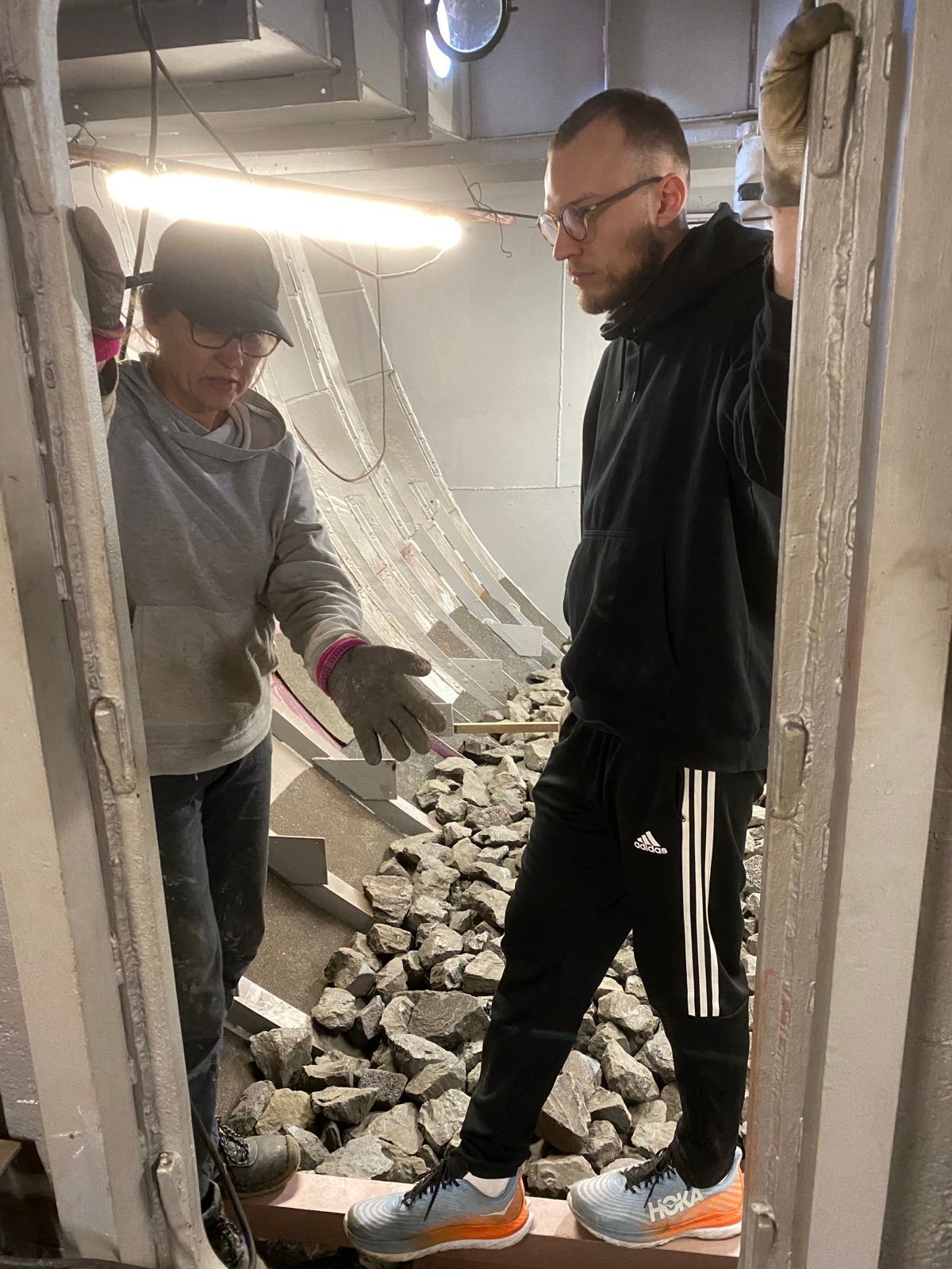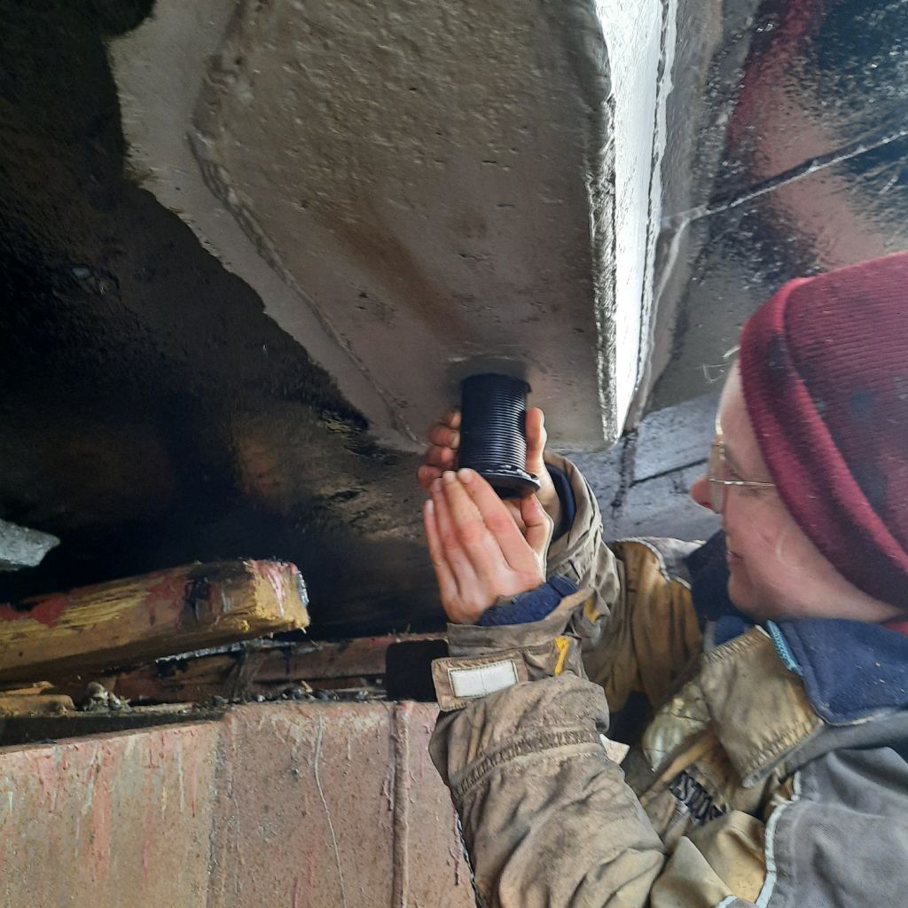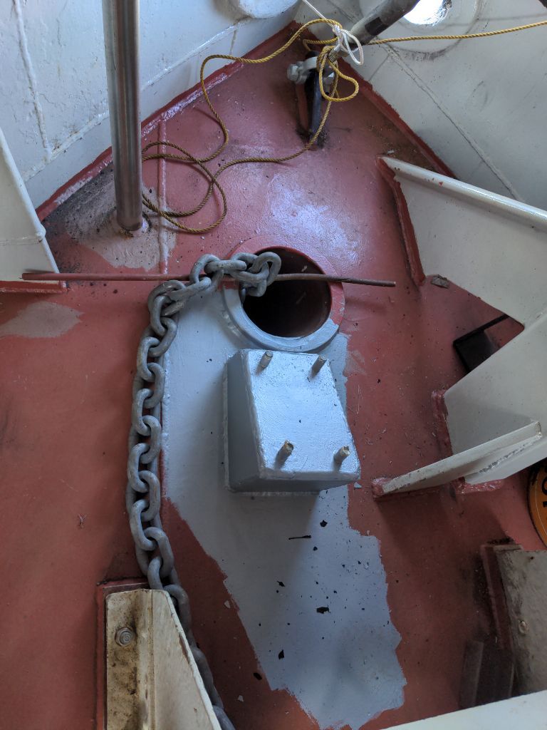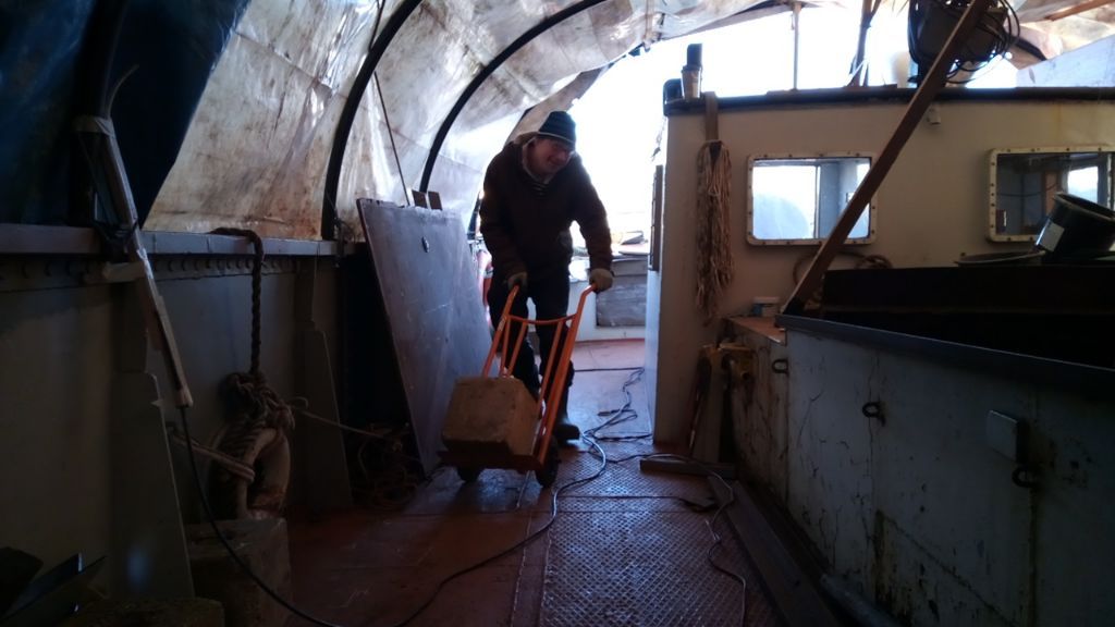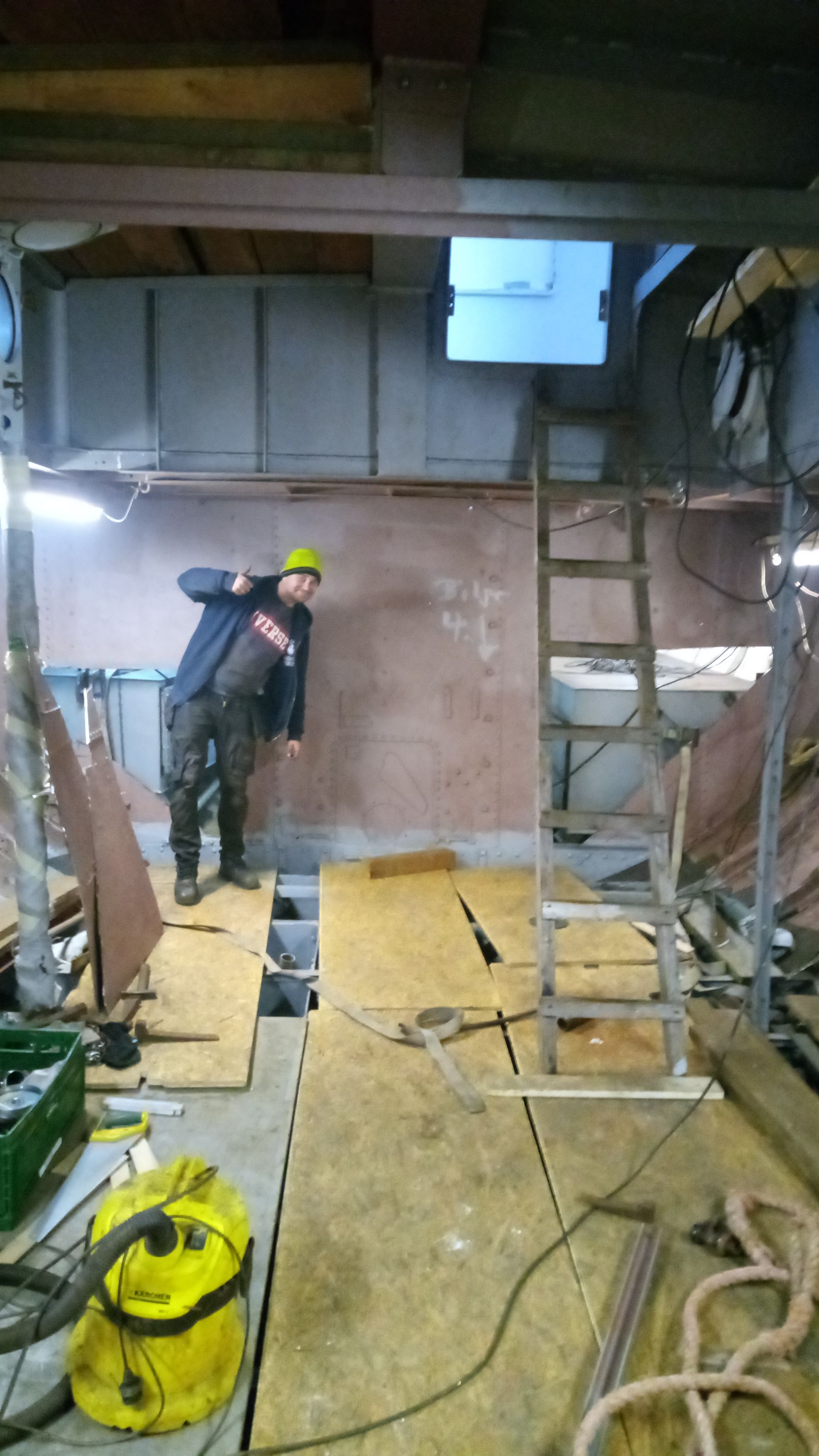 Carsten berichtet von den täglichen Fortschritten vor Ort. Simon, Mareile, Hauke und Carsten haben Beton aus dem Vorschiff gestemmt. Jetzt ist der Zugang zum Kollisionsschott frei. Kettenkasten und Vorpiek sind betonfrei.