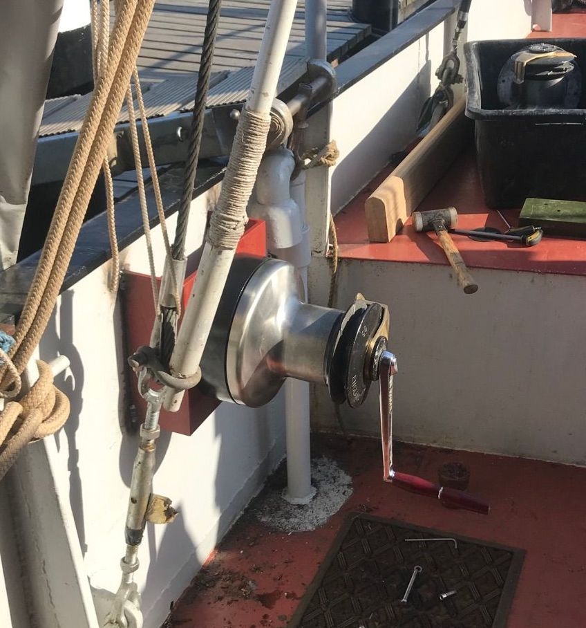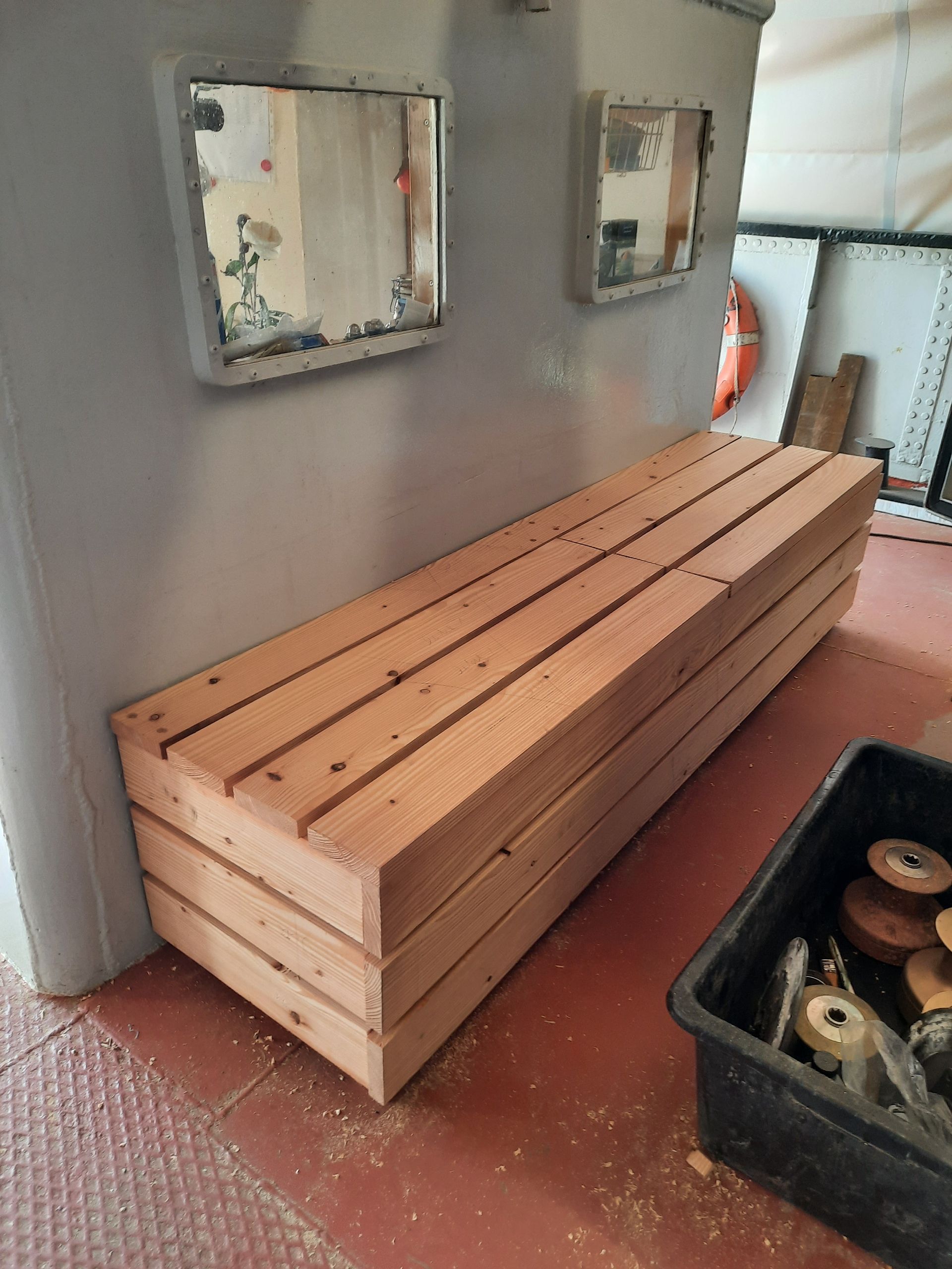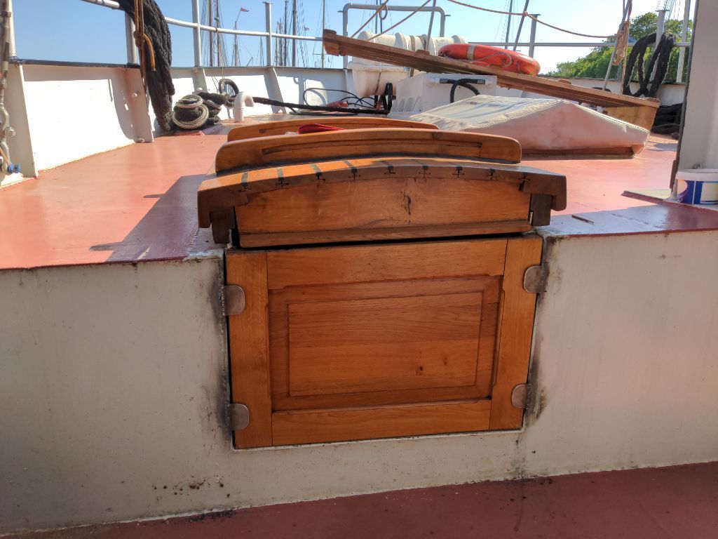 Der Termin fürs Probesegeln rückt näher. Fix hat Nagelbänke und Winschen bekommen. Und hinter dem Kartenhaus gibt es jetzt eine Sitzbank, in der die Rettungswesten verstaut werden.