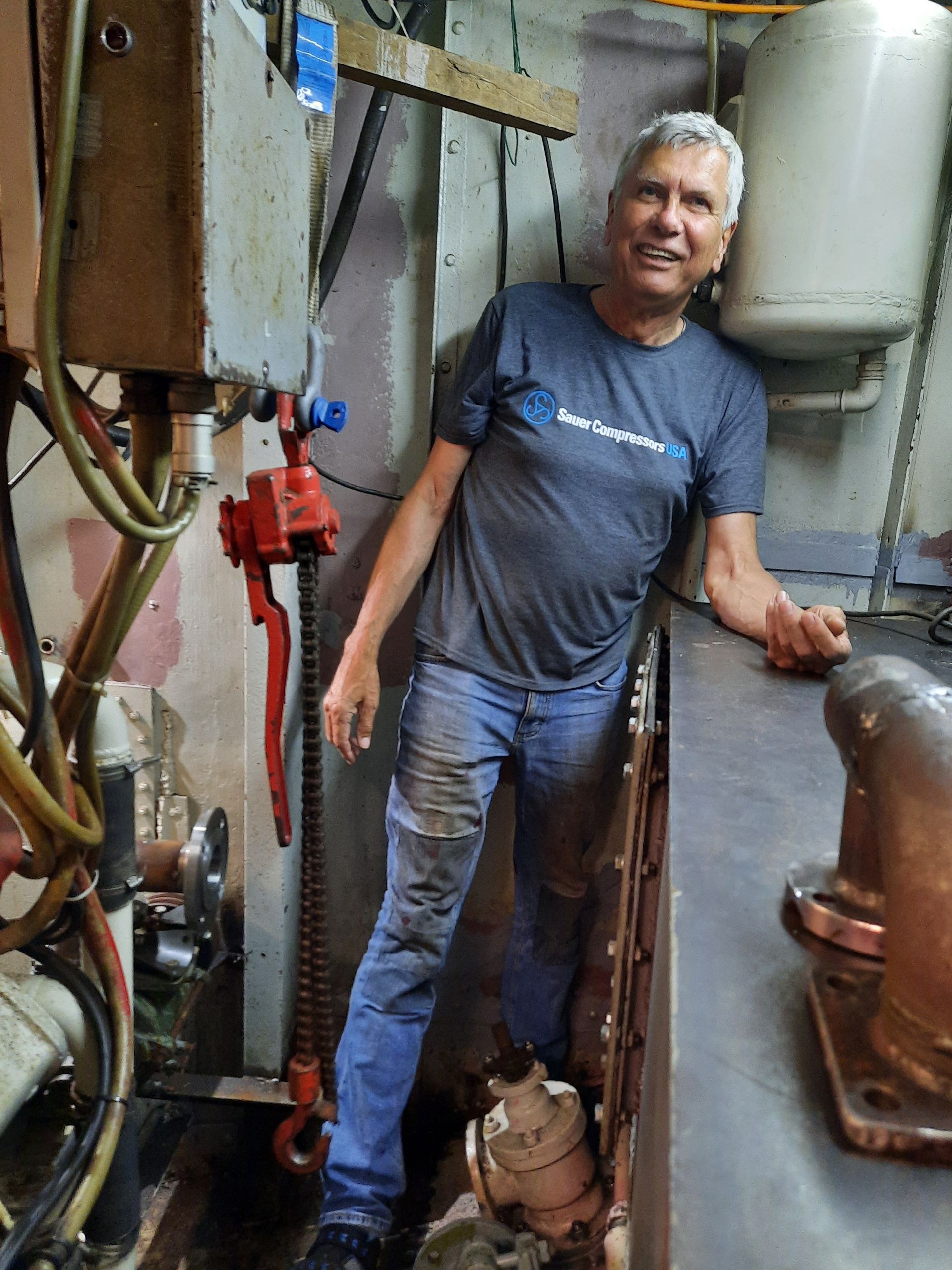 Heine baut im Maschinenraum die Lenzpumpe ein. Eine mobile Lenzpumpe befindet sich bereits an Deck.