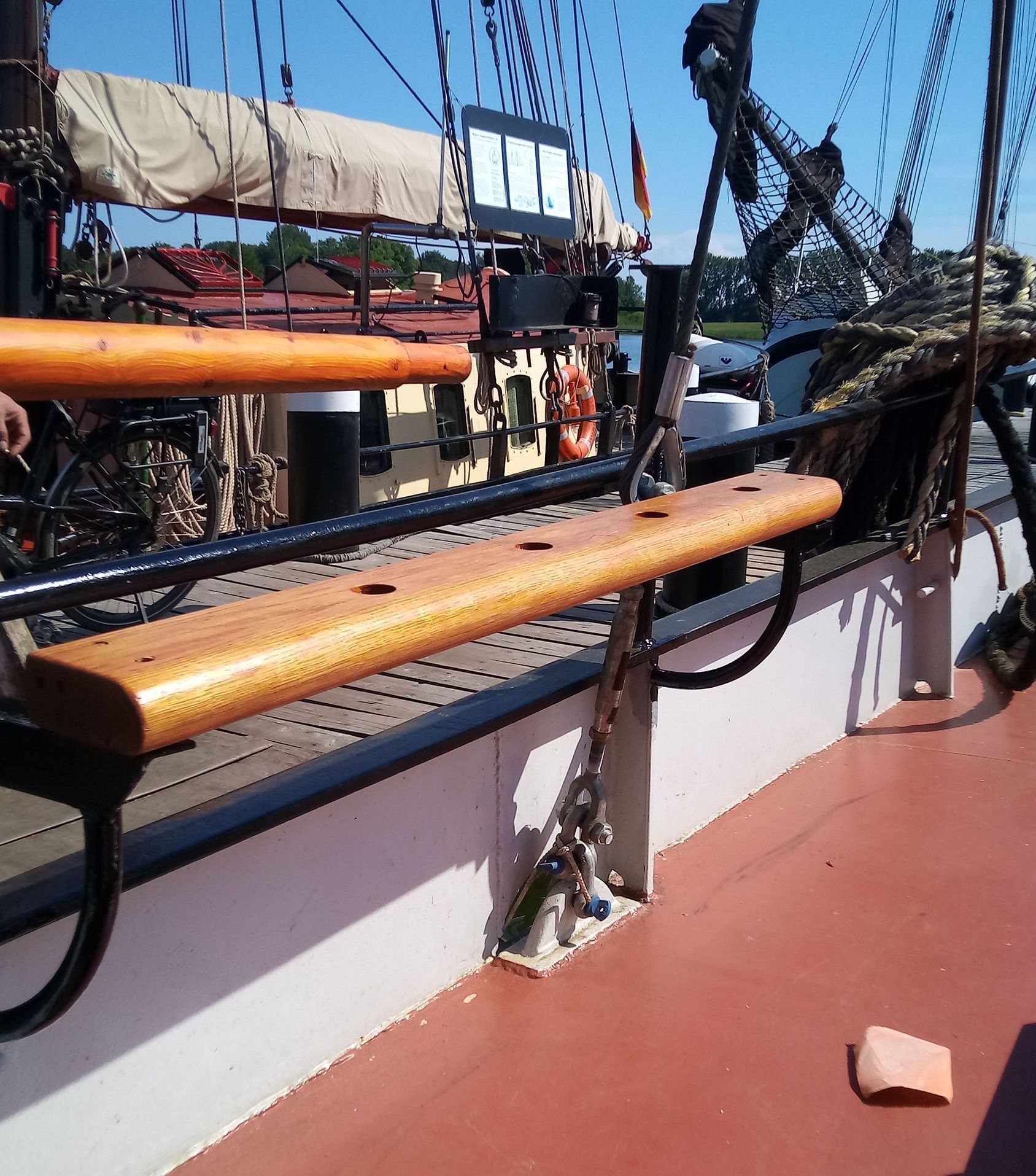 Joachim und Carsten haben auf dem Vorschiff die Schanzkleidstützen je nach Zustand wieder an Deck herunter ergänzt oder gleich neue gebaut.